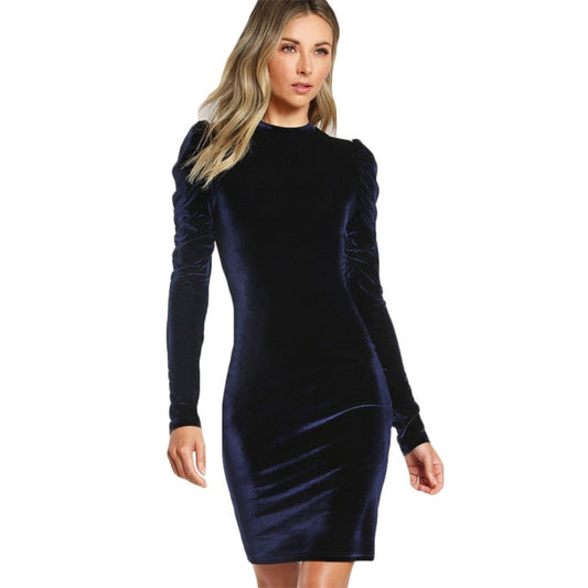 SHEIN Puff Sleeve Velvet Pencil Dress Womens Autumn Dresses Navy Long Sleeve Knee Length Elegant Party Dresses